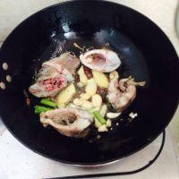 6.鱼块煎至两面略黄,下入香料爆锅。