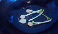 5.5.可以闻到很浓郁的香料味后,把葱段放入,继续用小火把葱爆香。