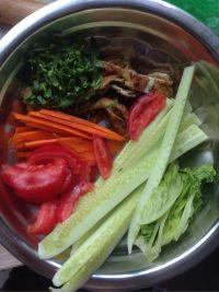 6.在自己这侧放黄瓜条,蛋饼条,生菜,西红柿和胡萝卜片,撒点香菜末。从自己这次卷起来。