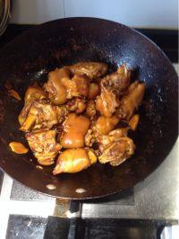 3.放入焯好的猪蹄翻炒,直至猪蹄金黄色,加入葱姜蒜、八角、花椒爆香