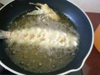 5.把腌好的鱼拿出来,均匀的抹上生粉,切记鱼缝里要抹到,要不然不立体,起定型作用的,抹好后准备下锅,下锅前记得抖一抖生粉,以免弄得一锅的渣渣