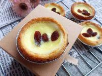7.然后取出烤盘再在蛋挞液上放入葡萄干,继续烤15~20分钟,烤至蛋挞皮金黄色即可
