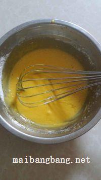 1.蛋黄加入植物油,牛奶,白砂糖20g搅拌均匀。