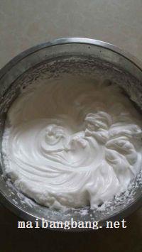 4.白砂糖35g分3次加入蛋白中,将蛋白打发至硬性发泡。